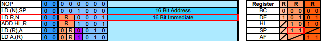 We can see that 0x31=0b00110001 corresponds to LD R,N where R=0b11=SP, and where N is the 16-bit immediate. It’s a 3-bytes long instruction. The first byte is the opcode. The second and third bytes are the 16-bit immediate. Instructions on the Game Boy can be 1, 2, or 3-bytes long.
