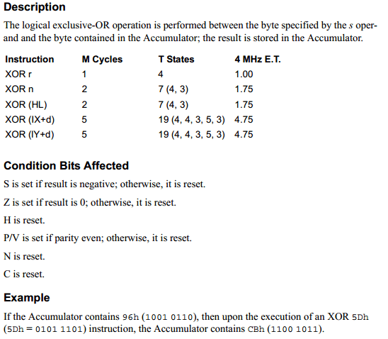 We’re gonna need to look at another document, UM0080.pdf to know what XOR does exactly. It’s the official documentation for the Z80, so it’s very accurate and well done, but keep in mind that the CPU in the Game Boy is not a Z80, so you can’t take it literally. As of this writing, the last update to that document was in August 2016, which I think is awesome: I mean, I can’t imagine that a processor from the 70s is widely used anymore, but they still update its documentation for typos and errors. For now, you only need to know that XOR has the same behavior in the Z80 and in the Game Boy.